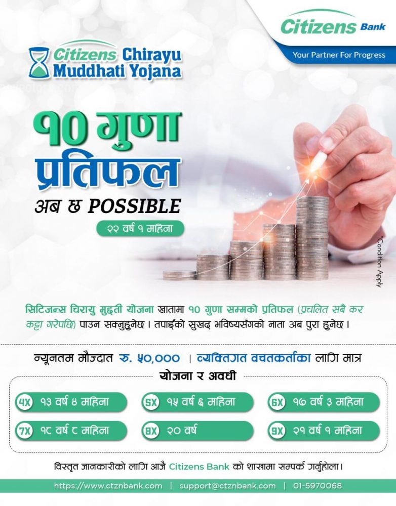 काठमाडौं । विगत डेढ दशकदेखि सर्वसाधारणलाई गुणस्तरिय र सुरक्षित सेवा तथा सूविधा दिदै आएको सिटिजन्स बैंकले २०७९, श्रावण २१ गते थप आकर्षक मुद्धती योजना ‘सिटिजन्स चिरायु मुद्दती योजना’ तथा ‘रेमिटेन्स चिरायु मुद्दती योजना’ खाताको शुभारंभ गरेको छ ।