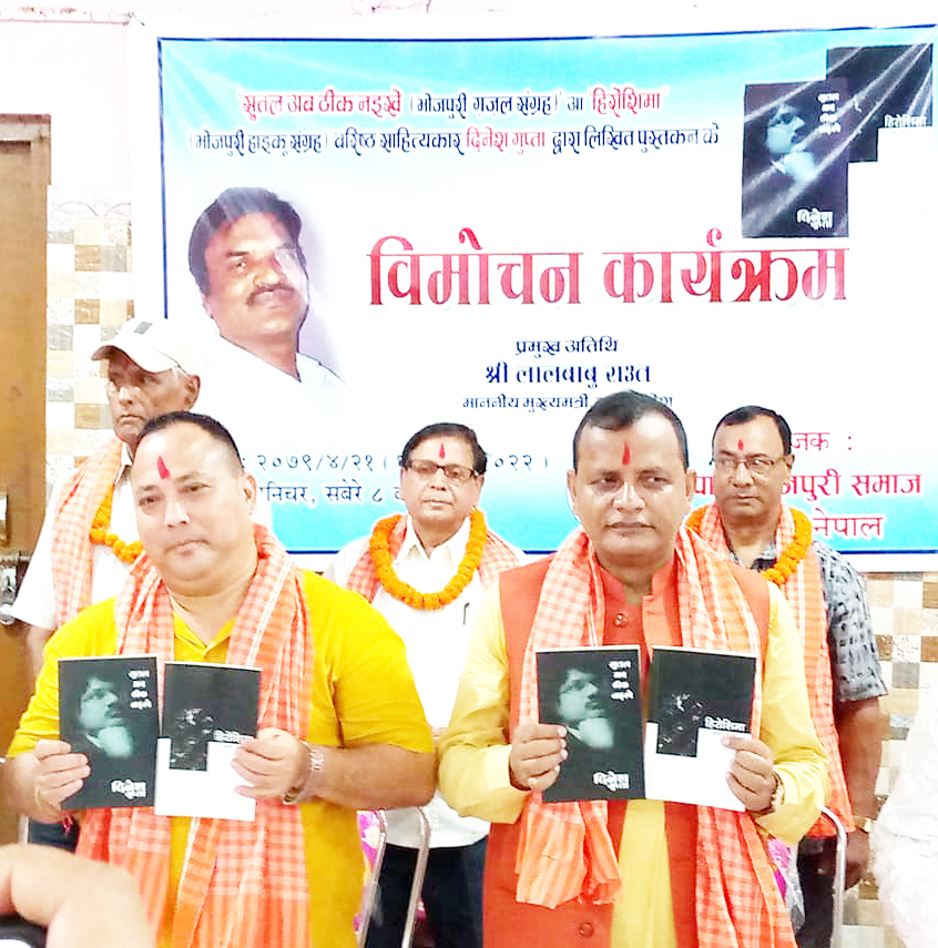 बीरगंज । मधेश प्रदेशका मुख्यमन्त्री लालबाबु राउत गदीले नेपाल प्रज्ञा प्रतिष्ठानका पुर्व प्राज्ञ सभा सदस्य र गोरखापत्र राष्ट्रिय दैनिक पत्रिकाका भोजपुरी भाषाका संयोजक दिनेश गुप्ताद्वारा लिखित गजल संग्रह सुतल अब ठीक नइखे र हाइकु संग्रह हिरोसिमा नामक दुईवटा पुस्तकको आज एक समाराहोका बीच बिमोचन गरे ।