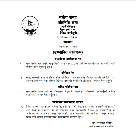 त्यस्तै, सभामुखले राष्ट्रपतिको कार्यालयबाट प्राप्त विधेयक प्रमाणीकरण सम्बन्धी पत्रको व्यहोरा पढेर सुनाउने तथा कृषि, सहकारी तथा प्राकृतिक स्रोत समितिका सभापति पूर्ण कुमारी सुवेदीले ‘पशु स्वास्थ्य तथा पशु सेवा परिषद् विधेयक सम्बन्धी समितिको प्रतिवेदन, २०७९’ पेस गर्ने कार्यसूची रहेकाे छ ।