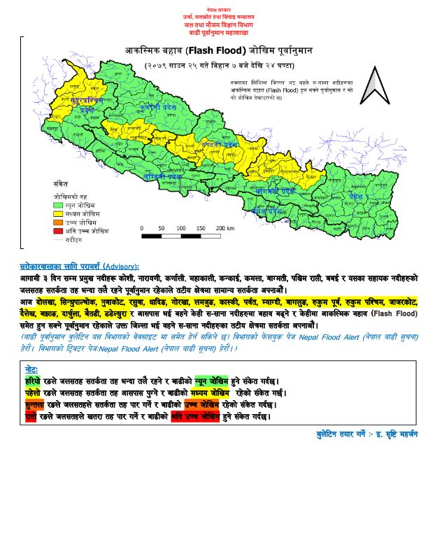 आज दोलखा, सिन्धुपाल्चोक, नुवाकोट, रसुवा, धादिङ, गोरखा, लमजुङ, कास्की, पर्वत, म्याग्दी, बागलुङ, रुकुम पूर्व, रुकुम पश्चिम, जाजरकोट, दैलेख, बझाङ, दार्चुला, बैतडी, डडेलधुरा र आसपास भई बहने केही साना नदीहरूमा पनि बहाव बढ्नेछ । केहीमा आकस्मिक बहावसमेत हुन सक्ने पूर्वानुमान छ । उक्त नदीतटीय क्षेत्रहरूमा सतर्कता अपनाउन महाशाखाले आग्रह गरेको छ ।