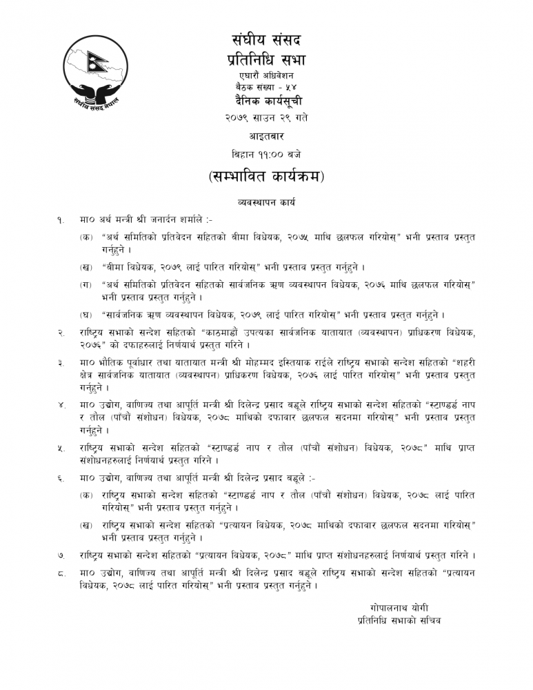 अर्थमन्त्री शर्माले नै ‘बिमा विधेयक, २०७९ लाई पारित गरियोस्’ भनी प्रस्ताव प्रस्तुत गर्ने, ‘अर्थ समितिको प्रतिवेदनसहितको सार्वजनिक ऋण व्यवस्थापन विधेयक, २०७६ माथि छलफल गरियोस्’ भनी प्रस्ताव प्रस्तुत गर्ने र ‘सार्वजनिक ऋण व्यवस्थापन विधेयक, २०७९ लाई पारित गरियोस्’ भनी प्रस्ताव प्रस्तुत गर्नेछन् ।