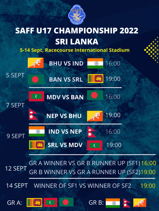 काठमाडाैं । दक्षिण एशियाली फुटबल महासंघ साफले श्रीलंकामा हुने साफ यू–१७ को तालिका सार्वजनिक गरेको छ । सहभागी छ टोलीलाई दुई समूहमा विभाजन गरिएको छ । समूह ए मा श्रीलंका, बंगलादेश र माल्दिभ्स रहेका छन् । त्यस्तै समुह बीमा नेपालसँगै भारत र भुटान रहेका छन् ।