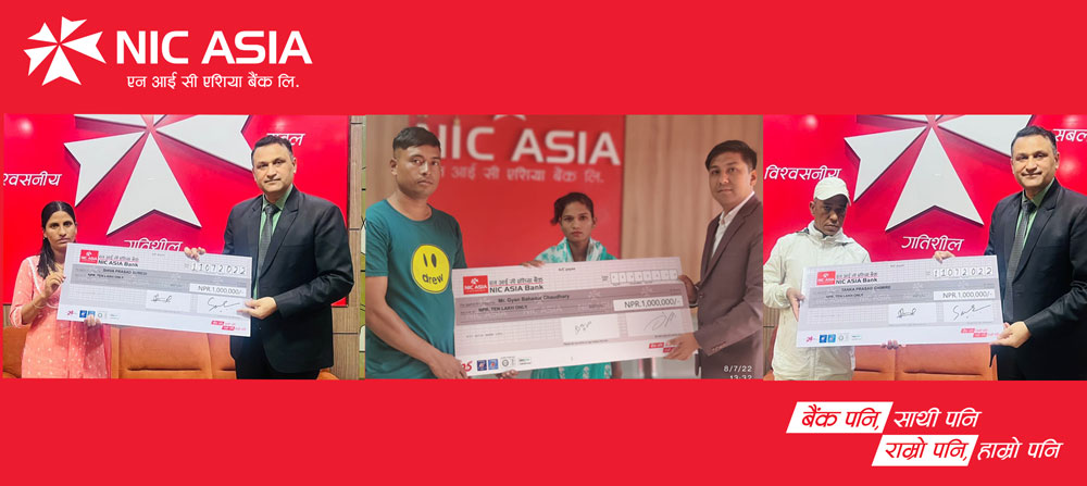 काठमाडौं । एनआईसी एशिया बैंकले सर्वश्रेष्ठ बचत खाता योजनाअन्तर्गत बैंकका विभिन्न शाखामा बचत खाता खोलेका तीनजना ग्राहकको दुर्घटनामा परि मृत्यु भएकाले बिमा लाभअन्तर्गत मृतक खातावालका परिवारलाई प्रतिव्यक्ति १० लाखका दरले कुल ३० लाख रुपैयाँ बिमा रकम दाबी भुक्तानी गरेको छ ।