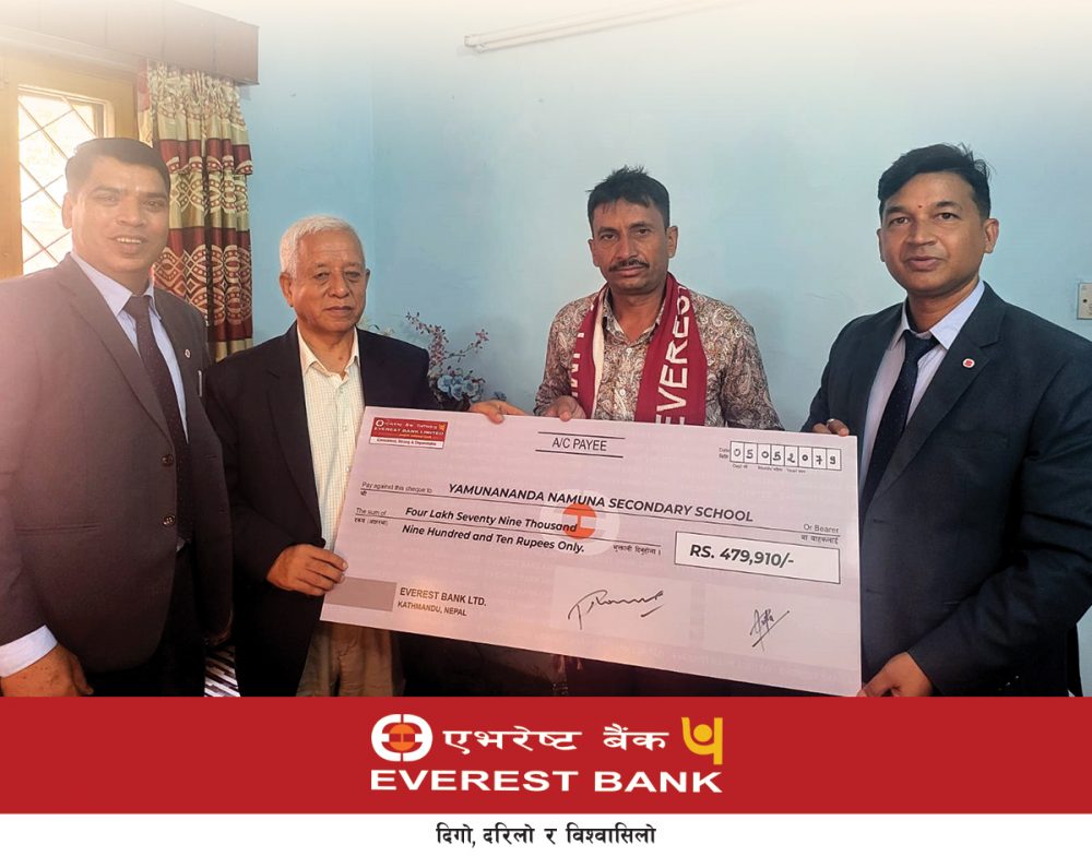 यसै सन्दर्भमा बैंकले एक कार्यक्रमका बिच मुसिकोट सेरिगाऊँ रुकुमको यमुनानन्द नमुना माध्यमिक विद्यालयलाई बेन्च र डेस्कको व्यवस्थापनको लागि चार लाख ६९ हजार नौ सय १० रुपैंयाँ आर्थिक सहयोग गरेको छ । सो कार्यक्रममा एभरेष्ट बैंकका संस्थागत सामाजिक उत्तरदायित्व कमिटीका तर्फबाट सदस्य डा. गणेश राज गुरुङ्गले विद्यालय व्यवस्थापन समितिका पूर्व अध्यक्ष महेन्द्र राज गौतमलाई चेक हस्तान्तरण गरेका हुन ।