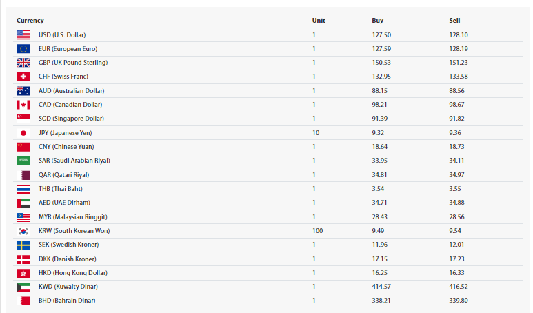 काठमाडौं । नेपाल राष्ट्र बैंकले आज (मंगलबार)का लागि विदेशी मुद्राको विनिमयदर तोकेको छ । नेपाल राष्ट्र बैंककाअनुसार विदेशी मुद्राको विनिमयदर अमेरिकी एक डलरको खरिददर १२७ रुपैयाँ ५० पैसा र बिक्रीदर १२८ रुपैयाँ १० पैसा रहेको छ ।