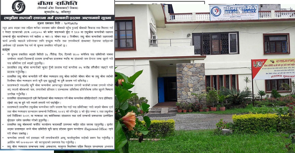 यसको लागि समितीले भदौ १० गते अर्थात आज शक्रबार सार्वजनिक सुचना जारी गर्दे ३५ दिन भित्रमा नयाँ बिमा कम्पनी खोल्न इच्छुक व्यक्ति संस्थाहरुसँग प्रस्ताव माग गरेको हो । न्युन आय भएका तथा लक्षित वर्गकाका जनतामा बिमाको पहुँच पुर्याइ बिमाको बिकास र बिस्तार गर्नको लागि आर्थिक बर्ष २०७९/०८० को बजेटको बुँदा ३२७ अनुसार लघुबिमा कम्पनीहरु सञ्चालनको लागि प्रस्ताव माग गरिएको समितीले जानकारी दिएको छ ।