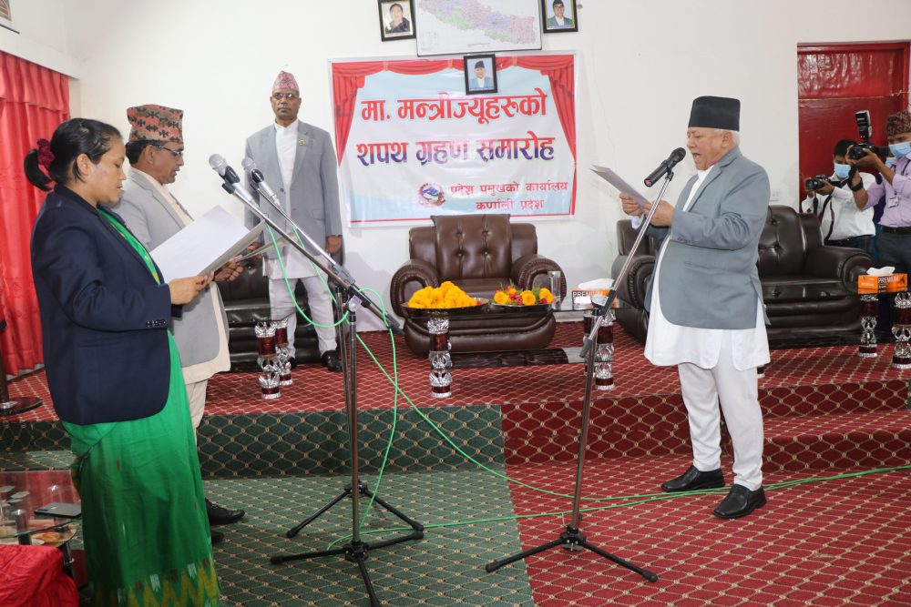 मुख्यमन्त्री तथा मन्त्रिपरिषद् कार्यालय सचिवालयका अनुसार नवनियुक्त दुई मन्त्रीको नाम प्रदेश प्रमुखको कार्यालयमा पठाइएको छ । प्रदेश प्रमुखको कार्यालयमा आज दिउँसो ३ बजे उनीहरुलाई शपथ ग्रहण गर्ने कार्यक्रम रहेको कर्णाली प्रदेश सरकारले जनाएको छ ।