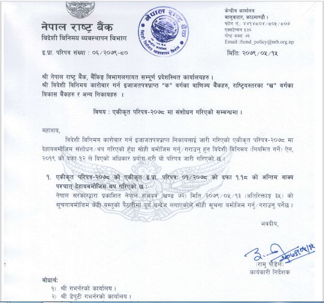 यो निर्देशन अनुसार गाडी, मोटरसाइकल, मोबाइल र मदिराको आयातमा बैंकहरुले तत्काल एलसी खोल्न पाउने छैनन् । सरकारले गत सोमबार राजपत्रमा सुचना जारी गर्दे गाडी, मोटरसाइकल, मोबाइल र मदिराको आयातमा २०७९ बैशाख १३ गतेबाट लगाएको प्रतिवन्धलाई २०७९ असोज २८ गतेसम्मको लागि निरन्तता दिने जानकारी दिएको थियो । सोही अनुसार राष्ट्र बैंकले बिहिबार परिपत्र जारी गर्दे यि चार वटा बस्तुहरुको आयातमा एलसी नखोल्न बैंकहरुलाई निर्देशन दिएको हो ।