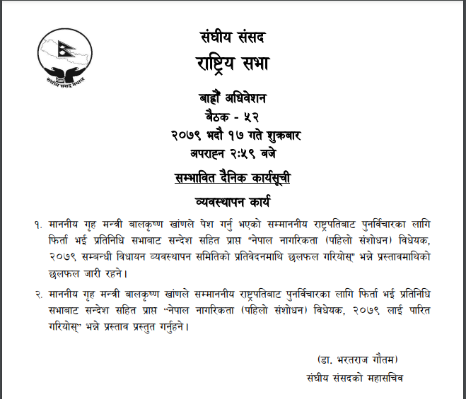 राष्ट्रियसभाको बैठक बस्दै, नागरिकता विधेयक पारित गर्ने सम्भावना