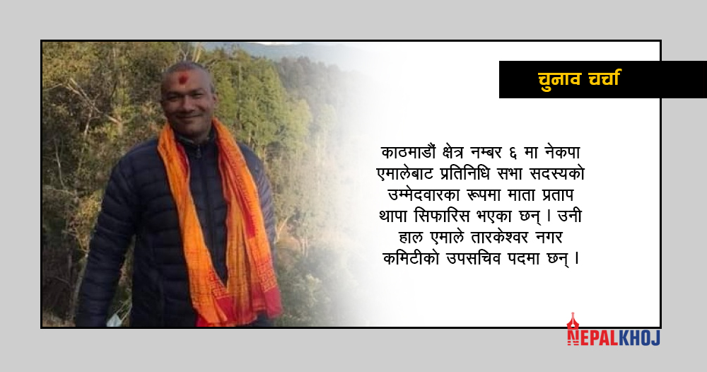 काठमाडौं । काठमाडौं क्षेत्र नम्बर ६ मा नेकपा एमालेबाट प्रतिनिधि सभा सदस्यको उम्मेदवारका रूपमा माता प्रताप थापा सिफारिस भएका छन् । तारकेश्वर नगरपालिका ११ नेपालटारका स्थानीयवासी थापा समाजसेवामा सक्रिय छन् । उनी हाल एमाले तारकेश्वर नगर कमिटीको उपसचिव पदमा छन् ।