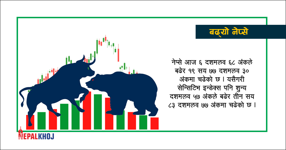 काठमाडौं । साताको पहिलो कारोबार दिन आइतबार नेप्से बढेको छ । नेप्से आज ६ दशमलव ६८ अंकले बढेर १९ सय ७७ दशमलव ३० अंकमा चढेको छ । यसैगरी सेन्सिटिभ इन्डेक्स पनि शुन्य दशमलव ५७ अंकले बढेर तीन सय ८३ दशमलव ७७ अंकमा चढेको छ । दुई सय २७ वटा कम्पनीहरुको २५ हजार ३७ पटकको कारोबारमा २८ लाख ७६ हजार दुई सय ८८ कित्ता सेयर खरिद बिक्री भएकोमा आज कुल कारोबार रकम एक अर्ब सात करोड १६ लाख १५ हजार नौं सय २२ रुपैयाँ पुगेको छ ।