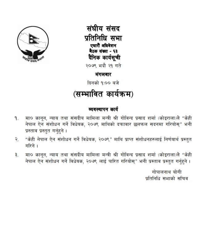 त्यस्तै प्राप्त संशोधनहरू निर्णयार्थ प्रस्तुत गरिनेछ । साथै सो विधेयक पारितका लागि मन्त्री शर्माद्वारा आजै प्रस्ताव प्रस्तुत गर्ने सम्भावित कार्यसूचीमा उल्लेख गरिएकाे छ ।