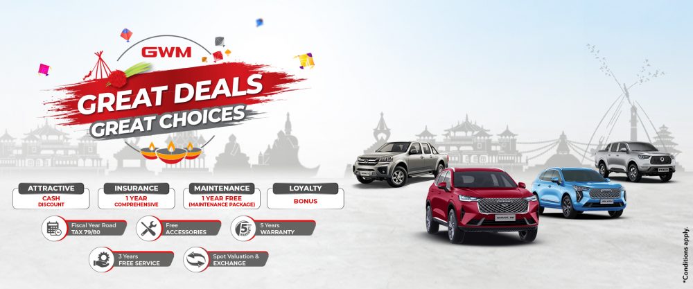 काठमाडौं । ग्रेट वाल मोटर (जि.डब्लु.एम) गाडीको नेपालका लागि आधिकारीक विक्रेता भि.जी. ईम्पेक्स प्रा.लि ले दशैँ, तिहार र छठको अवसर पारी जि.डब्लु एमका गाडीको खरीदमा आकर्षक छुटका साथ विभिन्न योजनाहरु उपलब्ध गराउने भएको छ ।