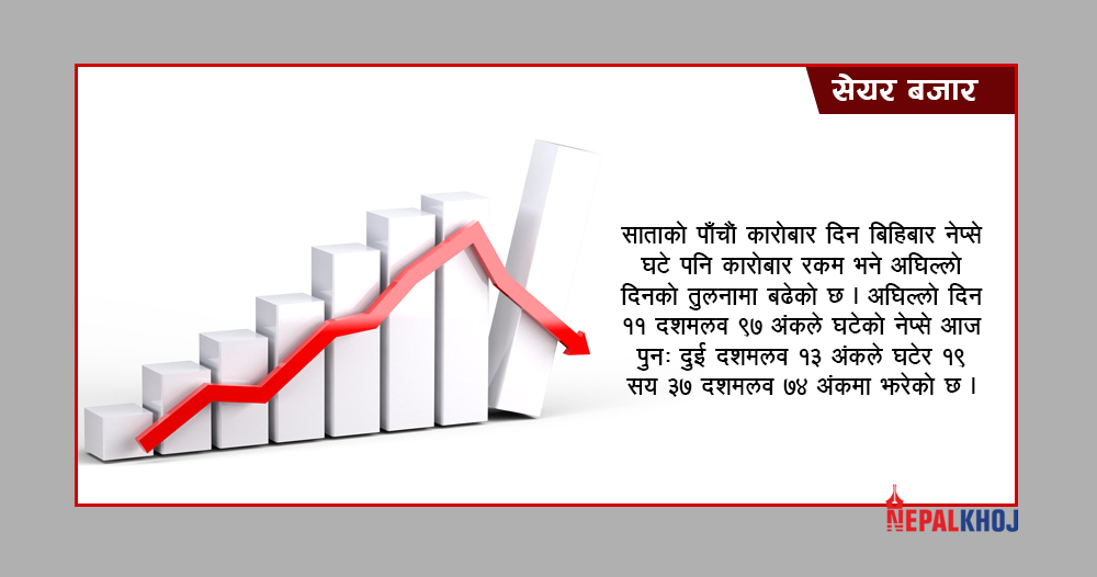 काठमाडौं । साताको पाँचौं कारोबार दिन आज नेप्से घटेपनि कारोबार रकम भने अघिल्लो दिनको तुलनामा बढेको छ । अघिल्लो दिन ११ दशमलव ९७ अंकले घटेको नेप्से आज (बिहीबार) पुन: दुई दशमलव १३ अंकले घटेर १९ सय ३७ दशमलव ७४ अंकमा झरेको छ । यसैगरी सेन्सिटिभ इन्डेक्स पनि शून्य दशमलव ५४ अंकले घटेर तीन सय ७६ दशमलव ८४ अंकमा झरेको छ ।