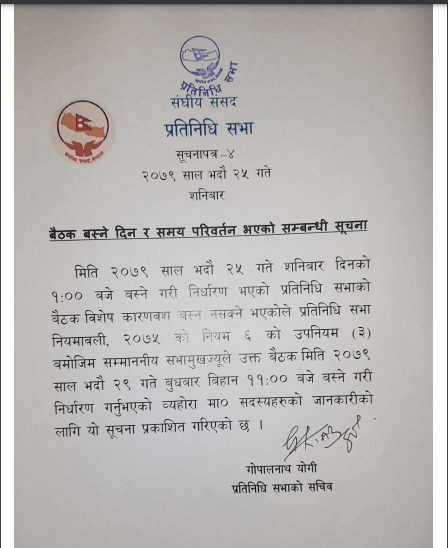 काठमाडाैं । प्रतिनिधिसभाको बैठक स्थगित भएकाे छ । आज दिउँसो १ बजे बस्ने भनिएकाे बैठक स्थगित भएकाे जनाइएकाे छ । संसद् सचिवालयले एक सूचना जारी गर्दै बैठक स्थगित भएको र अर्को बैठक भदौ २९ गते बुधबार बिहान ११ बजे बस्ने जनाएकाे छ ।