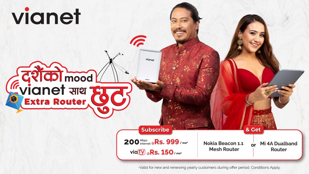 काठमाडौं । आउँदै गरेको दशैंमा ग्राहकलाई थप सुविधा दिने उद्देश्यले भायानेटले आकर्षक अफर ल्याएको छ । यो अफर अन्तर्गत अब भायानेटको अल्ट्रा-फाई इन्टरनेट जोड्ने ग्राहकले नोकिया बिकन १.१ मेस राउटर वा एमआई ४.ए डुअल ब्यान्ड राउटर आफ्नो इन्टरनेट सदस्यतामै प्राप्त गर्न सक्नेछन् ।