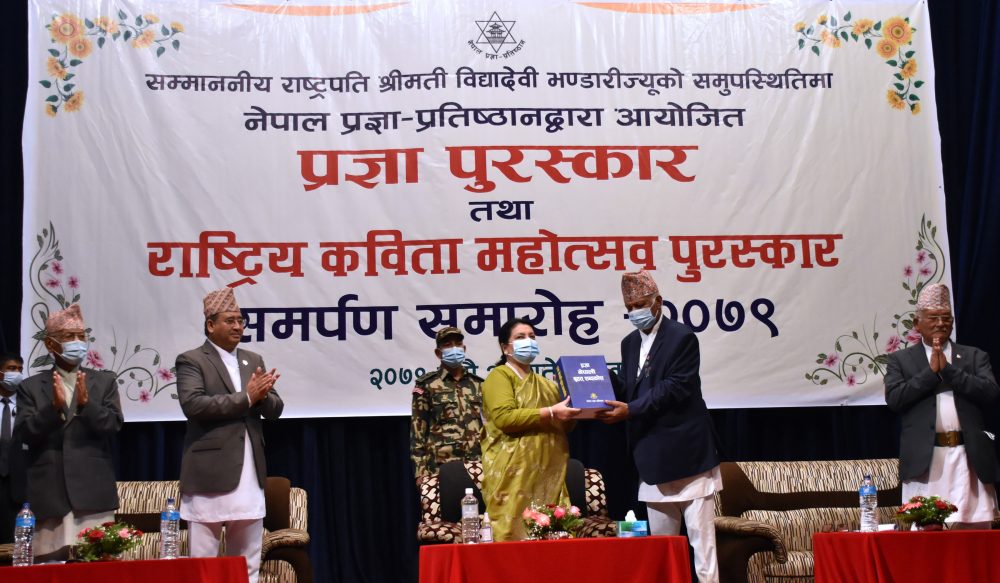 काठमाडौं । राष्ट्रपति विद्यादेवी भण्डारीले प्रतिभाको सम्मान चेतनाको सम्मान भएको बताएकी छन् । नेपाल प्रज्ञा प्रतिष्ठानले आज यहाँ आयोजना गरेको प्रज्ञा पुरस्कार तथा राष्ट्रिय कविता महोत्सव पुरस्कार समर्पण समारोहलाई सम्बोधन गर्दै उनले सत्पात्रलाई सम्मान गर्दा राष्ट्रको शिर उच्च हुने बताइन् ।