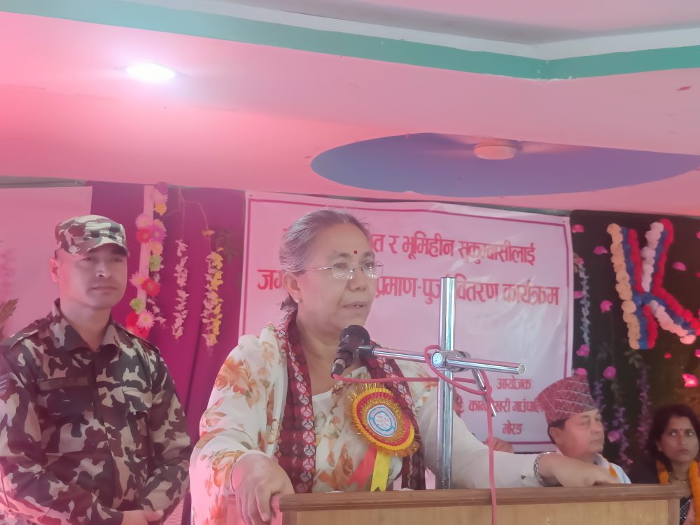 काठमाडौं । भूमि व्यवस्था, सहकारी तथा गरिवी निवारण मन्त्री शशी श्रेष्ठले आज मोरङ जिल्लाको कानेपोखरी गाउँपालिकामा भूमिहीन सुकुम्वासी र भूमिहीन दलित गरेर ३६ वटा लालपूर्जा वितरण गरेकी छन् ।
