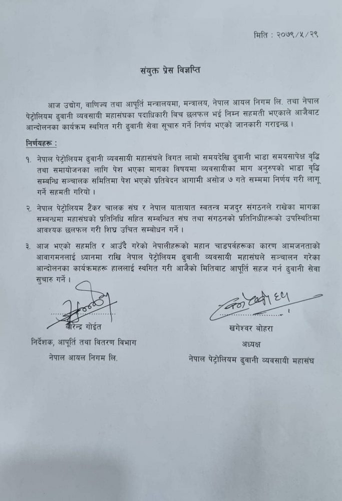 आजको वैठकमा नेपाल पेट्रोलियम ढुवानी व्यवसायी महासंघले विगत लामो समयदेखि ढुवानी भाडा समयसापेक्ष वृद्धि तथा समायोजनका लागि पेश भएका मागका विषयमा व्यवसायीका माग अनुरुपको भाडा वृद्धि सम्बन्धि सञ्चालक समितिमा पेश भएको प्रतिवेदन आगामी असोज ७ गते सम्ममा निर्णय गरी लागू गर्ने सहमति भएकाले स्थगीत गर्ने निर्णय गरिएको बताएको छ । त्यसैगरी नेपाल पेट्रोलियम टैंकर चालक संघ र नेपाल यातायात स्वतन्त्र मजदुर संगठनले राखेका मागका सम्बन्धमा महासंघको प्रतिनिधि सहित सम्बन्धित संघ तथा संगठनको प्रतिनिधिहरूको उपस्थितिमा आवश्यक छलफल गरी शिघ्र उचित सम्बोधन गर्ने सहमति भएकाे विज्ञप्तिमा जनाइएको छ ।