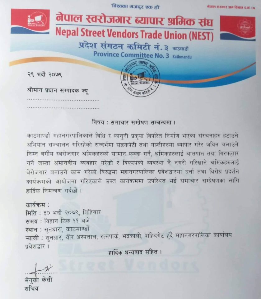 सडकपेटी तथा गल्लीहरुमा व्यापार गरेर जीवन चलाउने निम्न वर्गीय स्वरोजगार श्रमिकहरुको सामान कब्जा गर्ने, श्रमिकहरुलाई आतपात तथा गिरफ्तार गर्ने जस्ता अमानवीय व्यवहार गरेको आन्दोलनको घोषणा गरेकाे हाे ।