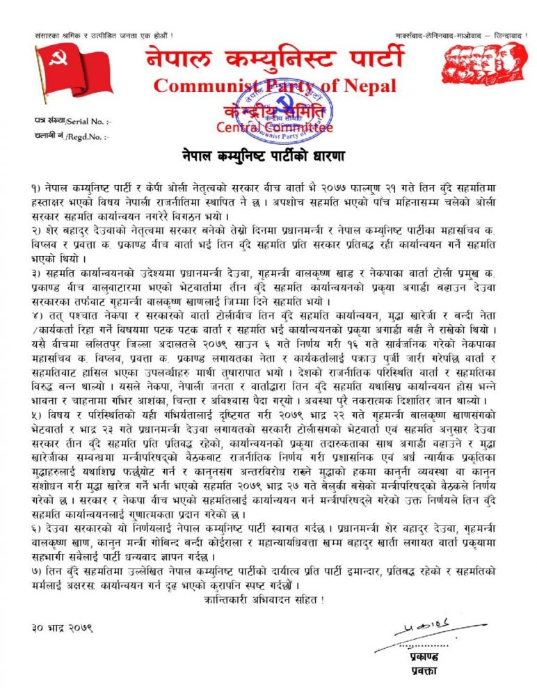 नेकपा प्रवक्ता खड्ग विश्वकर्मा प्रकाण्डले बिहीबार विज्ञप्ति निकालेर आफ्ना नेता तथा कार्यकर्तामाथि लागेको मुद्दा फिर्ता लिने सरकारको २७ भदौको निर्णय स्वागतयोग्य रहेको बताएका हुन् । गत ६ साउनमा ललितपुर जिल्ला अदालतले नेकपाका महासचिव विप्लव, प्रवत्ता प्रकाण्डलगायतका नेता र कार्यकर्तालाई पक्राउ पुर्जी जारी गरेको थियो । तर, चार दिनअघि २७ भदौ सोमबार बसेको मन्त्रिपरिषद् बैठकले आफ्ना नेता तथा कार्यकर्तामाथि लागेको मुद्दा फिर्ता लिने सरकारले निर्णय गरेको नेकपाले दाबी गरेको हो ।