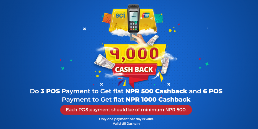 असोज १ गतेदेखि दशैंभर चल्ने यो योजनामा कम्तिमा तीन वटा पस कारोबार गर्ने कार्ड होल्डरलाई पाँच सय रुपैंयाँ तथा कम्तिमा छवटा पस कारोबार गर्ने कार्ड प्रयोगकर्तालाई एक हजार रुपैंयाँ क्यासब्याक प्रदान गरिने छ । क्यासब्याक प्राप्त गर्न हरेक पटकको कारोबार भुक्तानी रकम कम्तीमा पाँच सय रुपैयाँको हुनुपर्नेछ जसमा दिनको एउटा कारोबारलाई मात्र गणना गरिने छ ।