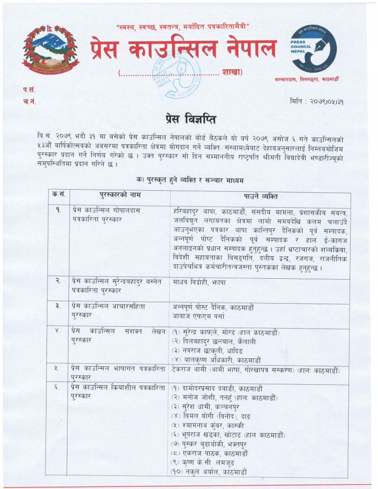 हिजो (शुक्रबार) बसेको प्रेस काउन्सिल बोर्ड बैठकले पत्रकारिता क्षेत्रमा योगदान पुर्याएका पत्रकार र सञ्चारमाध्यमलाई पुरस्कृत गर्ने निर्णय गरेको हो ।