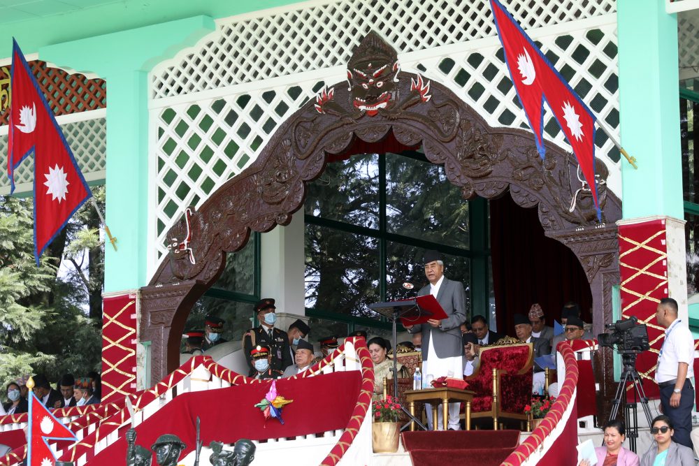 काठमाडौं । आठौँ संविधान दिवस २०७९ को अवसरमा आज (सोमबार) विभिन्न कार्यक्रम गरी मनाइएको छ । संविधान दिवस हरेक वर्ष असोज ३ गते राष्ट्रिय दिवसको रुपमा मनाइन्छ । त्यस्तैगरि आज टुँडिखेलमा आयोजित विशेष समारोहमा राष्ट्रपति विद्यादेवी भण्डारी, उपराष्ट्रपति नन्दबहादुर पुन, प्रधानमन्त्री शेरबहादुर देउवा लगायत उपस्थिति थिए ।