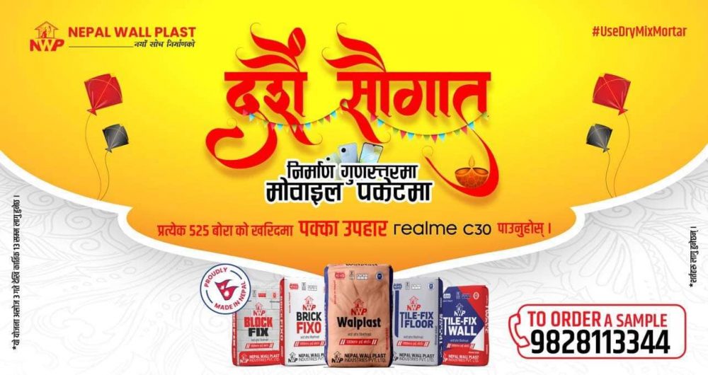 काठमाडाैं । ड्राइ मिक्स मोर्टार उत्पादक नेपाल वाल प्लास्टले नेपालीहरुको महान चाड बडा दशैंलाई लक्षित गरेर ‘दशैं सौगात’ नामक योजना बजारमा ल्याएको छ । ‘निर्माण गुणस्तरमा, मोवाइल पकेटमा’ नाराका साथ यो योजना असोज ३ गतेदेखि कार्तिक १३ गतेसम्मको लागि संचालन गर्न लागिएको जनाएको छ ।