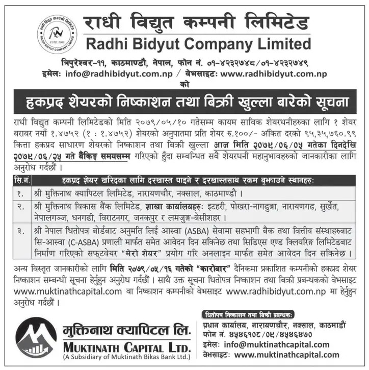 राधी विद्युत कम्पनीकाे आजदेखि हकप्रद बिक्री खुला