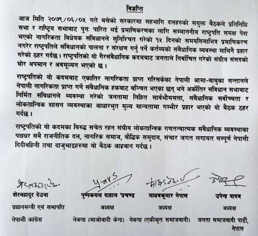 नेपाली कांग्रेस, नेकपा माओवादी केन्द्र, नेकपा एकीकृत समाजवादी र जनता समाजवादी पार्टीले संयुक्त विज्ञप्ति जारी गरी राष्ट्रपतिले संविधानको पालना गर्नुपर्ने कर्तव्यको संवैधानिक व्यवस्थामाथि नै प्रहार गरेको ठहर गरेका हुन् ।