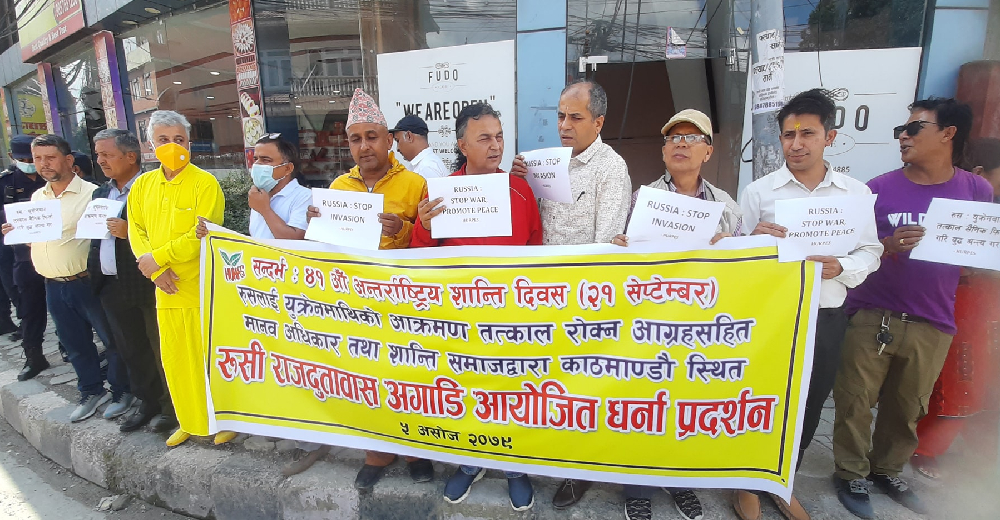 काठमाडौंमा रहेको रुसी राजदुतावास अगाडि आधा घण्टासम्म भएको धर्नामा शान्तिवादीहरुले रुस र युक्रेनको सार्वभौमसत्ताको सम्मान गर, रुस : युक्रेनबाट तत्काल सैनिक फिर्ता गरि युद्ध अन्त्य गर, रुस : युद्ध रोक, शान्ति प्रवद्र्धन गर, रुस : युक्रेनमाथि आक्रमण बन्द गर, शान्ति दिवसको सन्देश : युद्ध निषेध, शान्ति विशेष लेखिएका प्लेकार्डहरु प्रदर्शन गरेका थिए ।