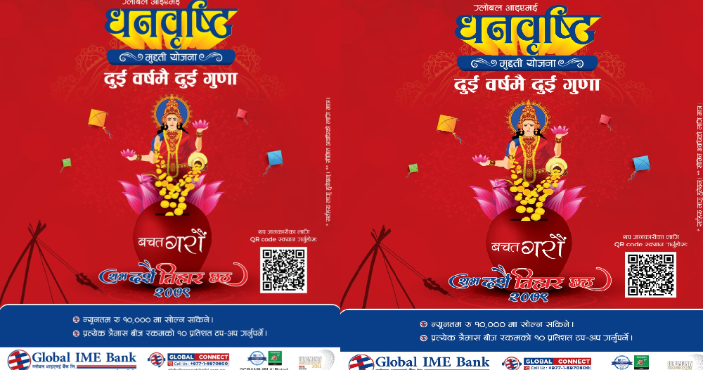 काठमाडौं । ग्लोबल आइएमई बैंक लिमिटेडले दुई वर्षमै दुई गुणा हुने मुद्दती योजना ‘ग्लोबल आइएमई धनवृष्टि मुद्दती योजना’ सार्वजनिक गरेको छ । यस मुद्दती निक्षेप योजनाअन्तर्गत ग्राहकहरुले दुई वर्षमै आफ्नो मुद्दती निक्षेप दोब्बर गर्न सक्ने छन् ।