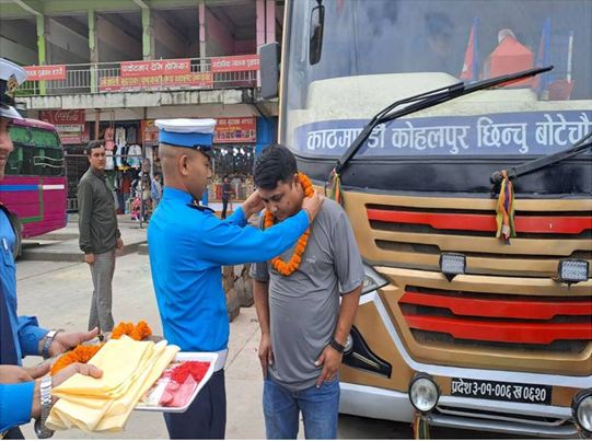सुरक्षित यात्राको कामना गर्दै ट्राफिक प्रहरीद्धारा चालकलाई फुलमाला