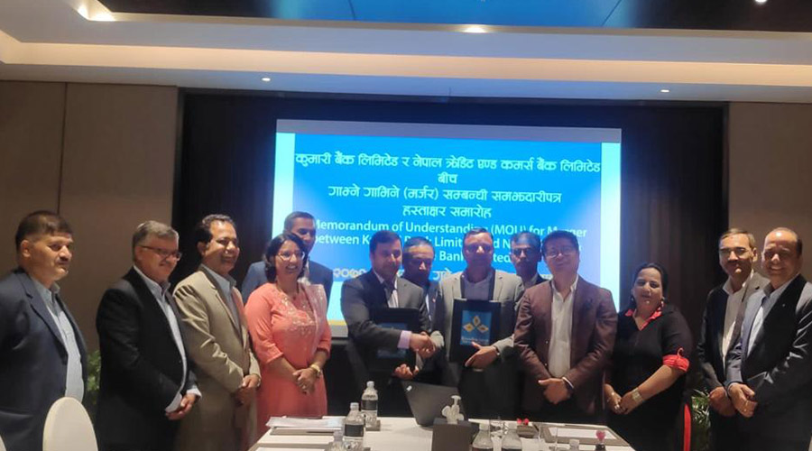 काठमाडाैं । नेपाल क्रेडिट एन्ड कमर्स बैंक र कुमारी बैंक एक आपसमा गाभिने भएका छन् । सञ्चालकहरुको कुरा मिलेपछि सोमबार मर्जरमा जाने सम्झौतापत्रमा हस्ताक्षर भएकाे हाे ।