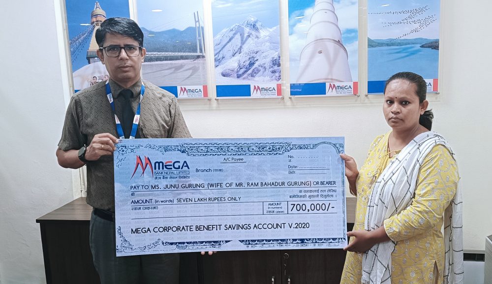 मेगा बैकमा ‘मेगा कर्पोरेट बेनीफिट सेभिङ्ग अकाउन्ट भि २०२०’ खोलेका नेपाली सेनाका राम बहादुर गुरुङ्गका परिवारलाई बैंकले सोही खातामा भएको योजना बमोजिम बीमा बापत सात लाख रुपैयाँ हस्तान्तरण गरेको हो । विराटनगरमा एक कार्यक्रमका बीच रकम मृतककी पत्नी जुनु गुरुङ्गलाई प्रदान गरिएको मेगा बैकले जनाएको छ । मृतक गुरुङ्गले नेपाली सेनाको २१ नम्बर बाहिनी अड्डा चारआलीमा कार्यरत रहँदा मेगा बैकको बिर्तामोड शाखामा ‘मेगा कर्पोरेट बेनीफिट सेभिङ्ग अकाउन्ट भि २०२०’ खोलेका थिए ।