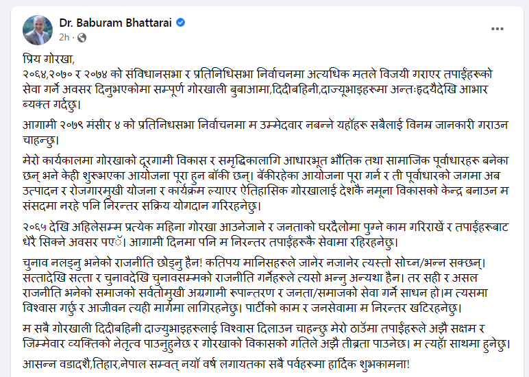 उनी लेख्छन् ‘आगामी २०७९ मंसीर ४ को प्रतिनिधिसभा निर्वाचनमा म उम्मेदवार नबन्ने यहाँहरू सबैलाई विनम्र जानकारी गराउन चाहन्छु ।’ यसअघि डा. भट्टराईले आगामी प्रतिनिधि सभा निर्वाचन माओवादी केन्द्रको चुनाव चिह्नबाट लड्ने निर्णय गरेका थिए ।