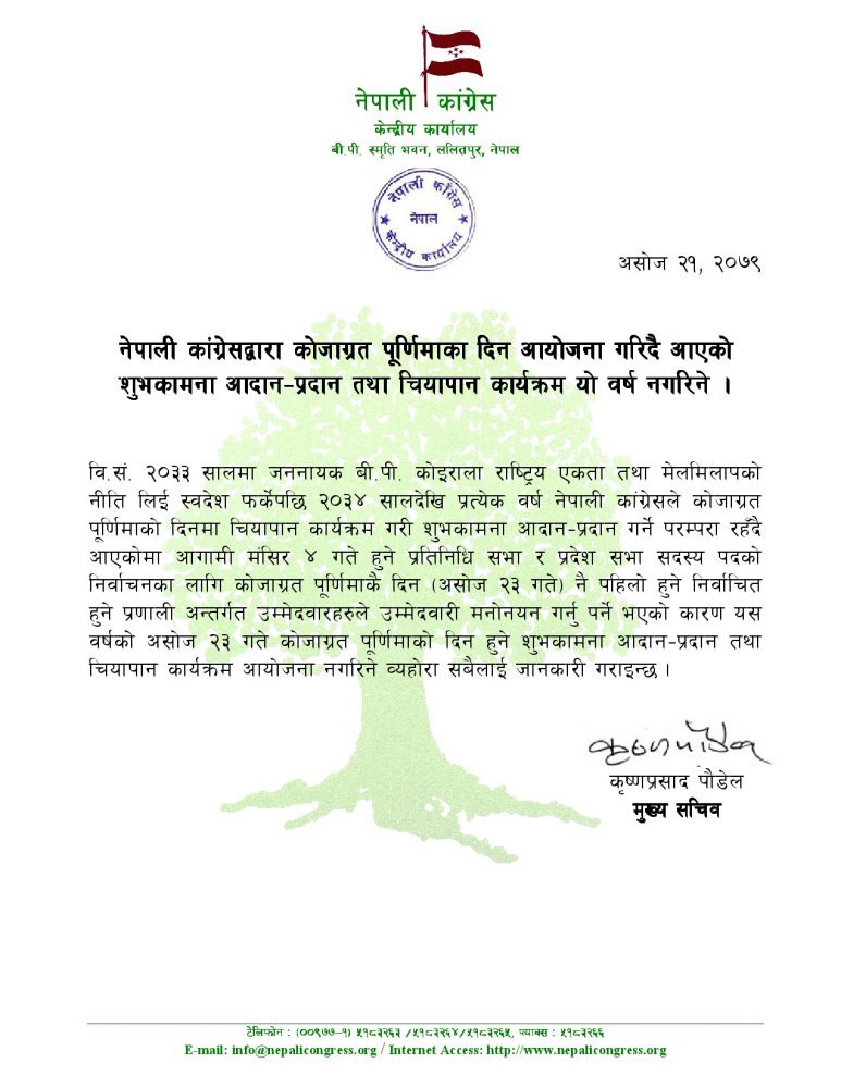 आगामी मंसिर ४ गते हुने प्रतिनिधि सभा र प्रदेश सभा सदस्य पदको निर्वाचनका लागि कोजाग्रत पूर्णिमाकै दिन (असोज २३ गते) नै पहिलो हुने निर्वाचित हुने प्रणाली अन्तर्गत उम्मेदवारहरुले उम्मेदवारी मनोनयन गर्नु पर्ने भएको छ । यस वर्षकोे असोज २३ गते कोजाग्रत पूर्णिमाको दिन हुने शुभकामना आदान-प्रदान तथा चियापान कार्यक्रम आयोजना नगरिने कांग्रेसले जनाएको छ ।