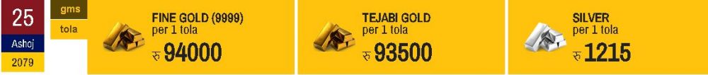 त्यसैगरी, आज चाँदीको मूल्य १५ रुपैयाँले घटेको छ । चाँदी आज प्रतितोला १२ सय १५ रुपैयाँमा कारोबार भइरहेको महासंघले जनाएको छ । सोमबार चाँदी प्रतितोला १२ सय ३० रुपैयाँमा कारोबार भएको महासंघले जनाएको छ ।