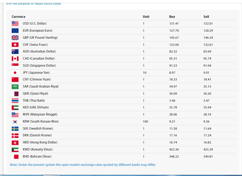 त्यसैगरी, जापानी येन १० को खरिददर ८ रुपैयाँ ९७ पैसा रहेको छ भने बिक्रीदर ९ रुपैयाँ ०१ पैसा रहेको छ । यसैगरी साउदी रियाल एकको खरिददर ३४ रुपैयाँ ९७ पैसा रहेको छ भने, बिक्रीदर ३५ रुपैयाँ १३ पैसा रहेको राष्ट्र बैंकले जनाएको छ ।
