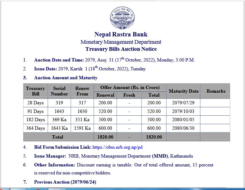 जारी मिति भने कार्तिक एक गते तोकिएको ट्रेजरी खरिदको लागि वाणिज्य बैंक, विकास बैंक र फाइनान्स कम्पनीहरुले भाग लिन पाउनेछन । बिक्री गरिने कुल ट्रेजरी मध्येमा २८ दिने अवधिको दुई अर्ब, ९१ दिने अवधिको पाँच अर्ब २० करोड, एक सय ८२ दिने अवधिको पाँच अर्ब र तीन सय ६४ दिने अवधिको छ अर्ब रुपैयाँ बराबरको रहेको छ ।