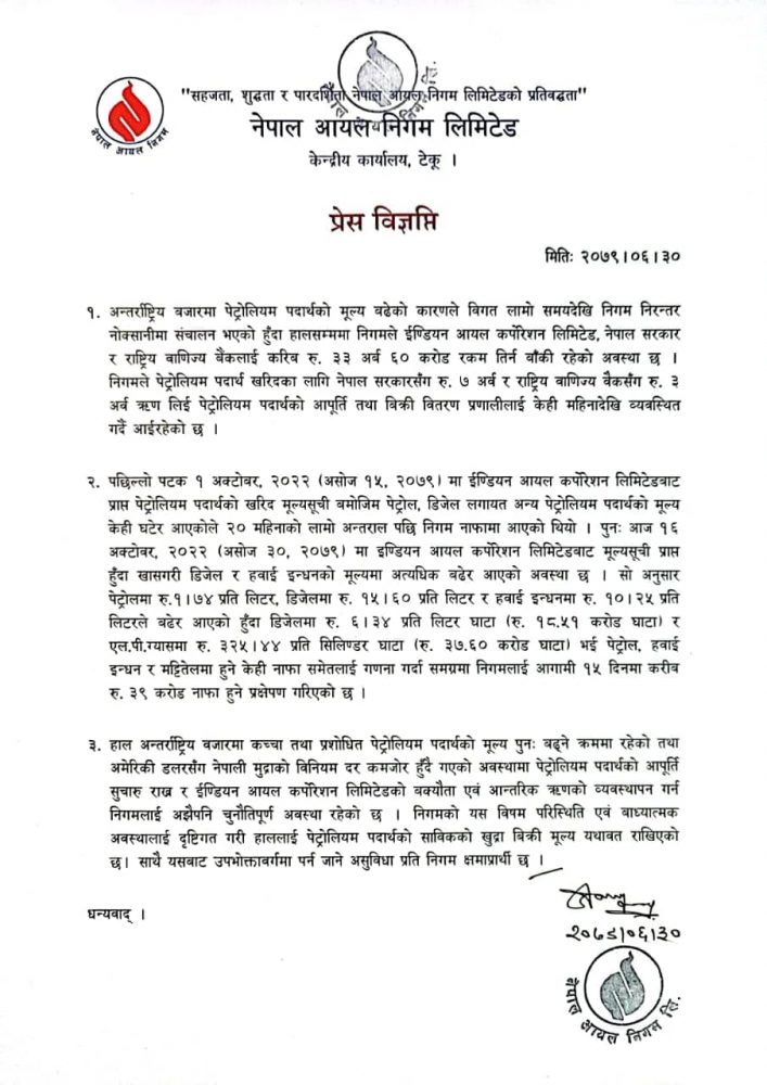जसअनुसार पेट्रोलमा रु१.७४ प्रति लिटर, डिजेलमा रु १५.६० प्रति लिटर र हवाई इन्धनमा रु १०.२५ प्रति लिटरले बढेर आएको छ ।  नयाँ मूल्यले डिजेलमा रु ६.३४ प्रति लिटर घाटा  र एलपी ग्यासमा रु ३२५.४४ प्रति सिलिन्डर घाटा हुने भएपनि पेट्रोल, हवाई इन्धन र मट्टितेलमा हुने केही नाफा समेतलाई गणना गर्दा समग्रमा निगमलाई आगामी १५ दिनमा करीब रु ३९ करोड नाफा हुने प्रक्षेपण गरिएको छ ।