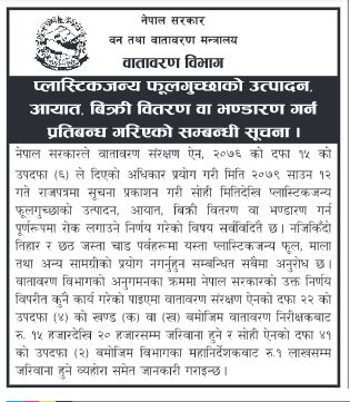 वन तथा वातावरण मन्त्रालय वातावरण विभागले एक सूचना जारी गर्दै प्लास्टिकजन्य फूलगुच्छाको उत्पादन, आयात, बिक्री वितरण तथा भण्डारण गर्न प्रतिबन्ध गरिएको र बिक्री वितरण गरेमा १ लाखसम्म जरिवाना लगाइने जनाएकाे छ । सूचनामा गत साउन १२ गते नेपाल राजपत्रमा सूचना निकालेर सोही मितिदेखि प्लास्टिकजन्य फूलगुच्छाको उत्पादन, आयात, बिक्री वितरण वा भण्डारण पूर्ण रूपमा रोक लगाउने निर्णय भएको उल्लेख छ ।