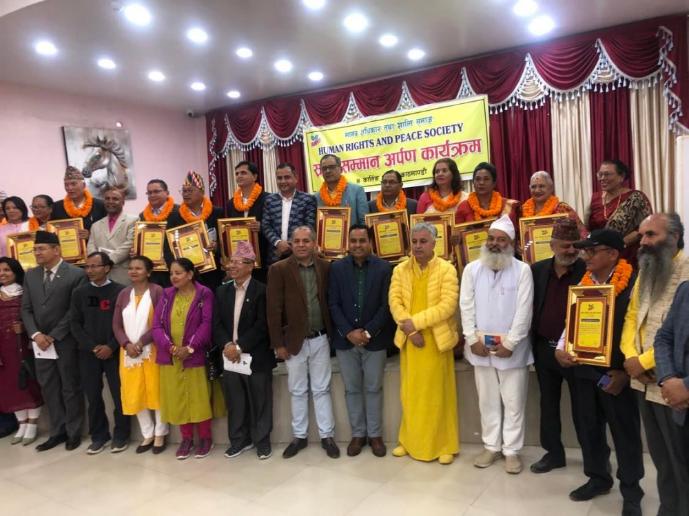 काठमाडौं । मानव अधिकार तथा शान्ति समाजद्वारा स्रष्टा सम्मान अभियान अन्तर्गत स्थापित पुरस्कारहरु कार्तिक ४ गते काठमाडौं, विराटनगर र तुलसीपुर (दाङ)मा कार्यक्रम आयोजना गरि प्रदान गरिएको छ ।