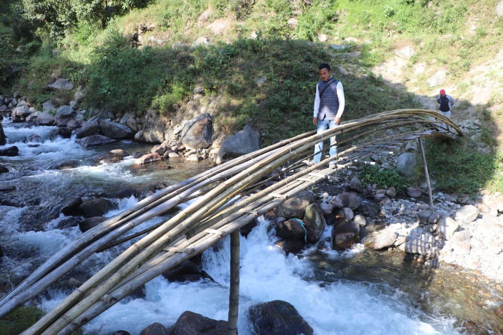 भोजपुर साल्पासिलिछो गाउँपालिकाको फेदीमा बनाइएको बास फड्केबाट खोला तर्दै । नजिकै झोलुङ्गे पुल भए पनि स्थानीयले थप सहजताका लागि जोखिम मोलेर फड्केबाट खोला तर्ने गरेका छन् ।