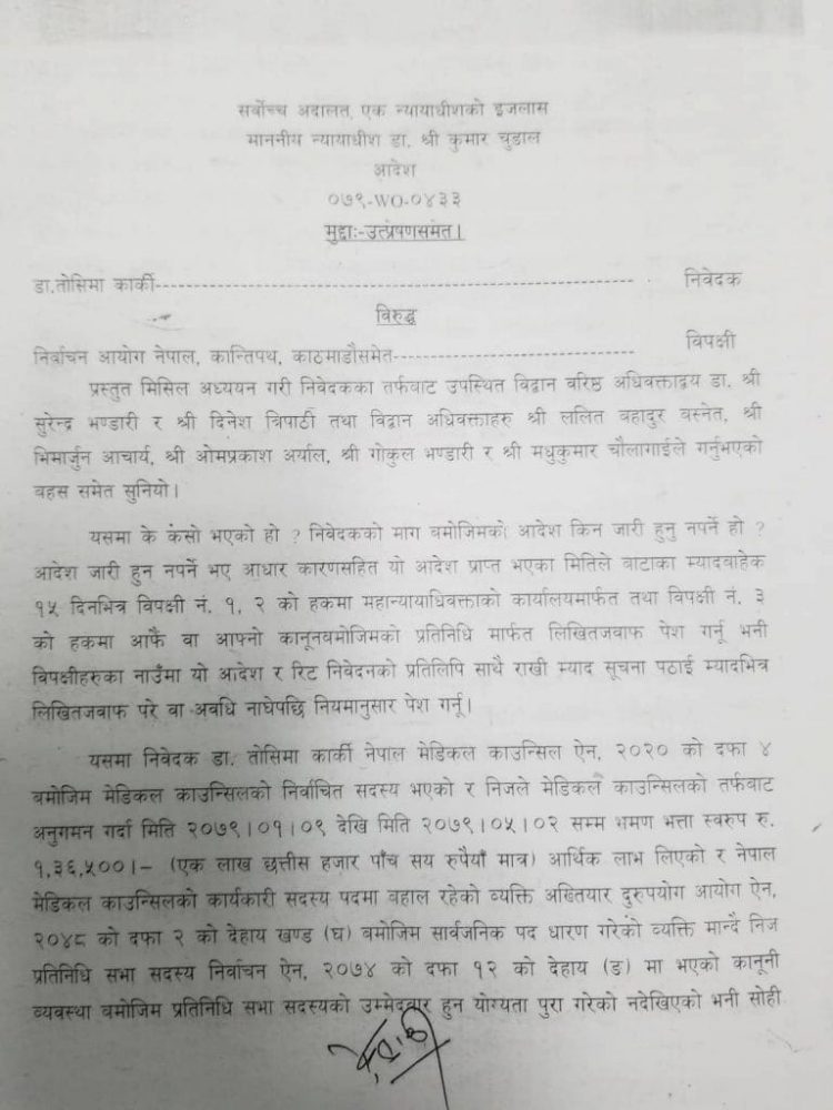 सर्वोच्च अदालतले ललितपुर–३ मा राष्ट्रिय स्वतन्त्र पार्टीकी उम्मेदवार डा. तोसिमा कार्कीको उम्मेदवारी तत्काल खारेज नगर्न निर्वाचन आयोगका नाममा अन्तरिम आदेश दिएकाे छ ।