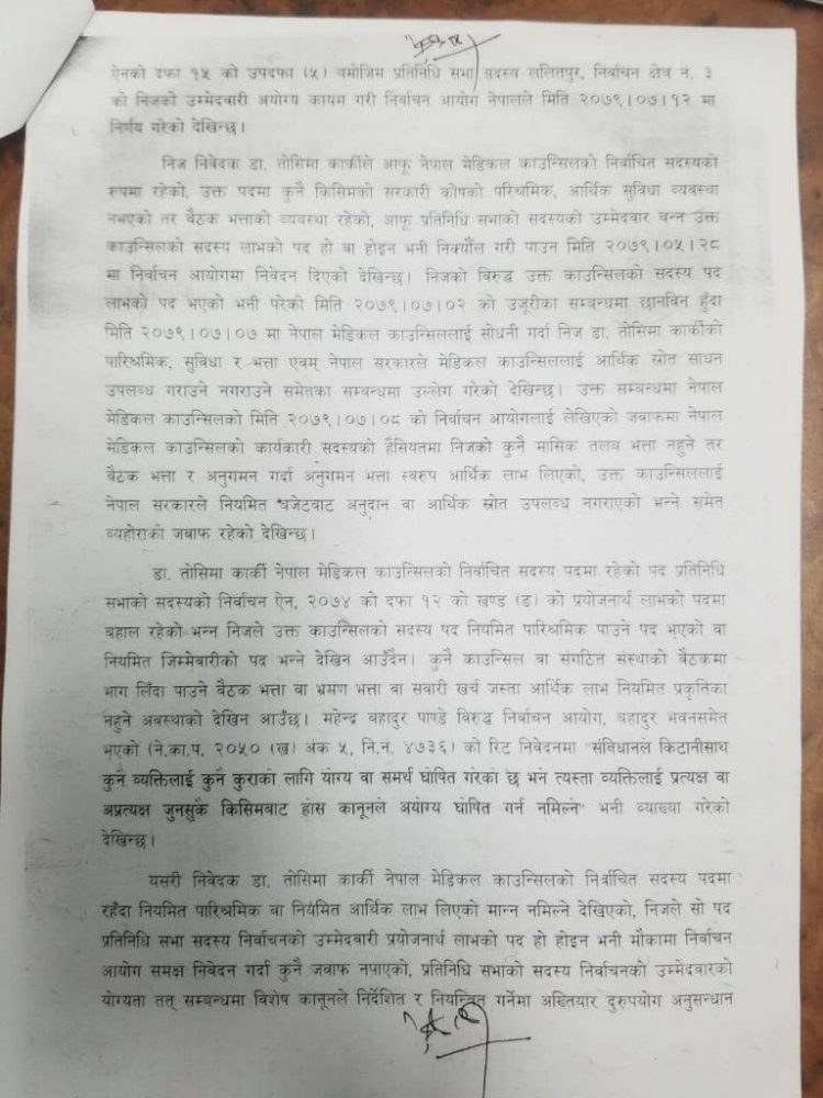 शनिबार आयोगले मेडिकल काउन्सिलको सदस्य पदमा रहेको र उत्त पद लाभको पद भएको दाबी गर्दै कार्कीको उम्मेदवारी रद्द गरेको थियो ।