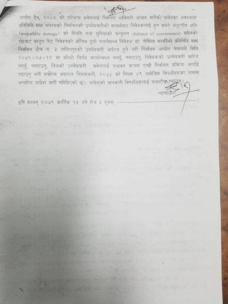 उक्त निर्णयविरुद्ध सर्वोच्चमा दिएको रिटको सुनुवाइ गर्दै न्यायाधीश कुमार चुडालको एकल इजलासले मंगलबार उम्मेदवारी कायम गर्न अन्तरिम आदेश दिएको हो ।