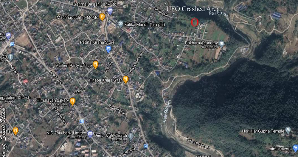 दुर्घटनाग्रस्त भएको अज्ञात बस्तु पोखरा विमानस्थल देखी अन्दाजी ८ किलोमिटर उत्तर बाटुलेचौरको कालीखोला नजिकै २८°१५’४६” उत्तरी अक्षांस तथा ८३°५९’१०” पूर्वी देशान्तरमा खसेको थियो । २० हजार फिट भन्दा माथी दुर्घटना भएको यो अज्ञात यान खस्ने क्रममा १० किमिको वरपर यसका टुक्राहरु छरिएर खसेको थियो ।