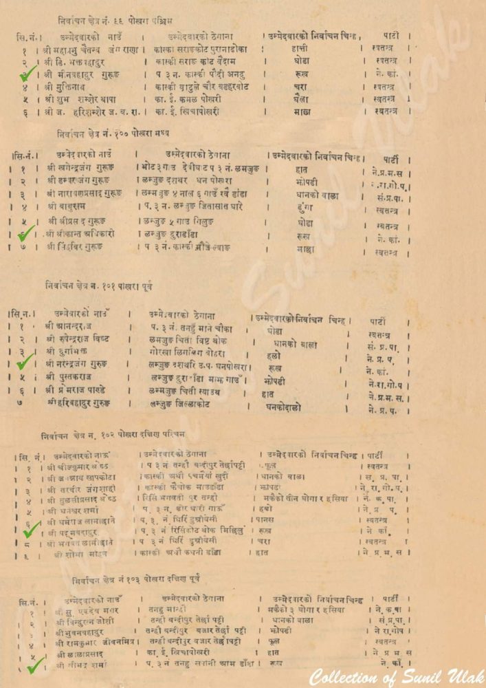 ६४ वर्ष अघि नेपालीहरुले पहिलो पटक प्रतिनिधि सभाका लागि आफ्नो मत दिने कामको शुरुवात गरेका थिए । २०१५ सालको उक्त चुनावमा पश्चिम ३ नम्बर क्षेत्रमा प्रतिनिधि सभाकाका उम्मेदवारहरुको नामावली तथा निर्वाचनमा विजयीहरुको नाम (टिक लगाएको) यहाँ प्रस्तुत छ ।